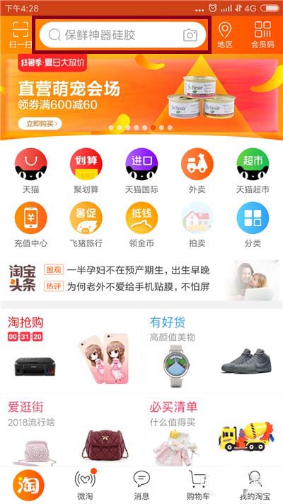 2、进入淘宝首页后在上方点击【搜索栏】。
