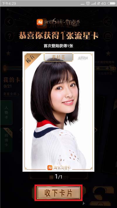 5、初次进入活动界面后,系统会赠送我们一张流星卡,点击收下就可以获得我们的第一张流星卡啦。