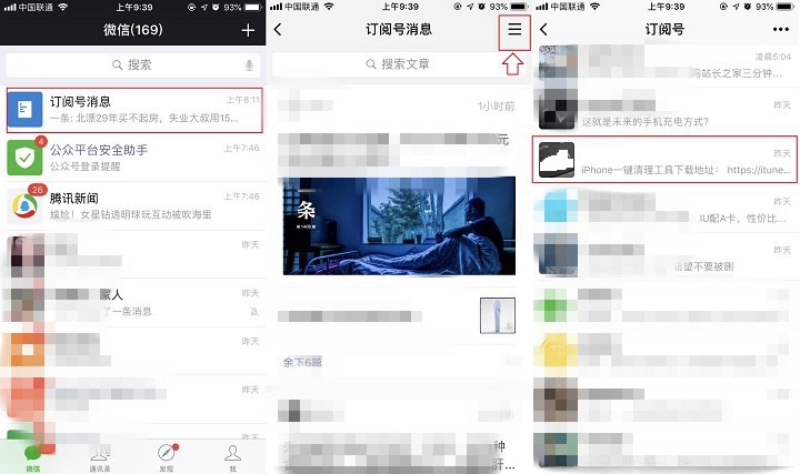 第一步:首先在手机中打开微信,然后进入“订阅号消息”,之后再点击右上角“菜单”图标,接下来找到“电脑百事网”公众号,并点击进入,如下图所示。