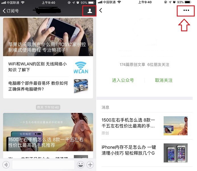 第二步:进入订阅号阅读页面之后,点击右上角的“头像”图标,然后会进入“公众号”主页界面,再点击右上角的 “...”三个点菜单图标,如下图所示。
