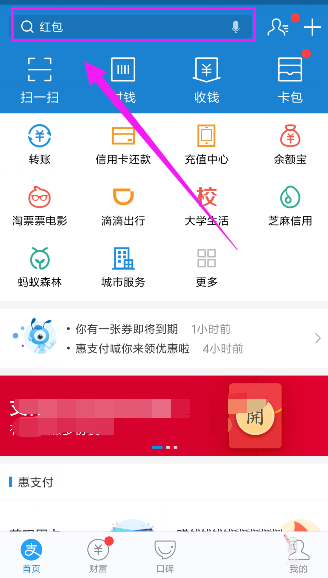 2、然后,来到支付宝首页,点击搜索位置,如图所示