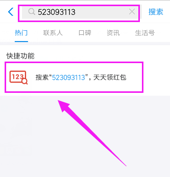 3、然后,输入领大红包码:523093113,点击搜索,你会搜索到天天领红包,点击,你就会获得大红包了,如图所示