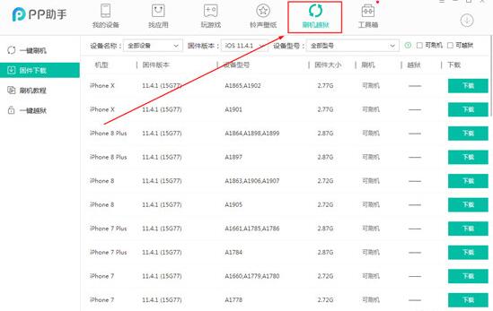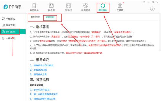 三、重点的来了,点击PP助手界面右上角的“刷机越狱”选项,如图: