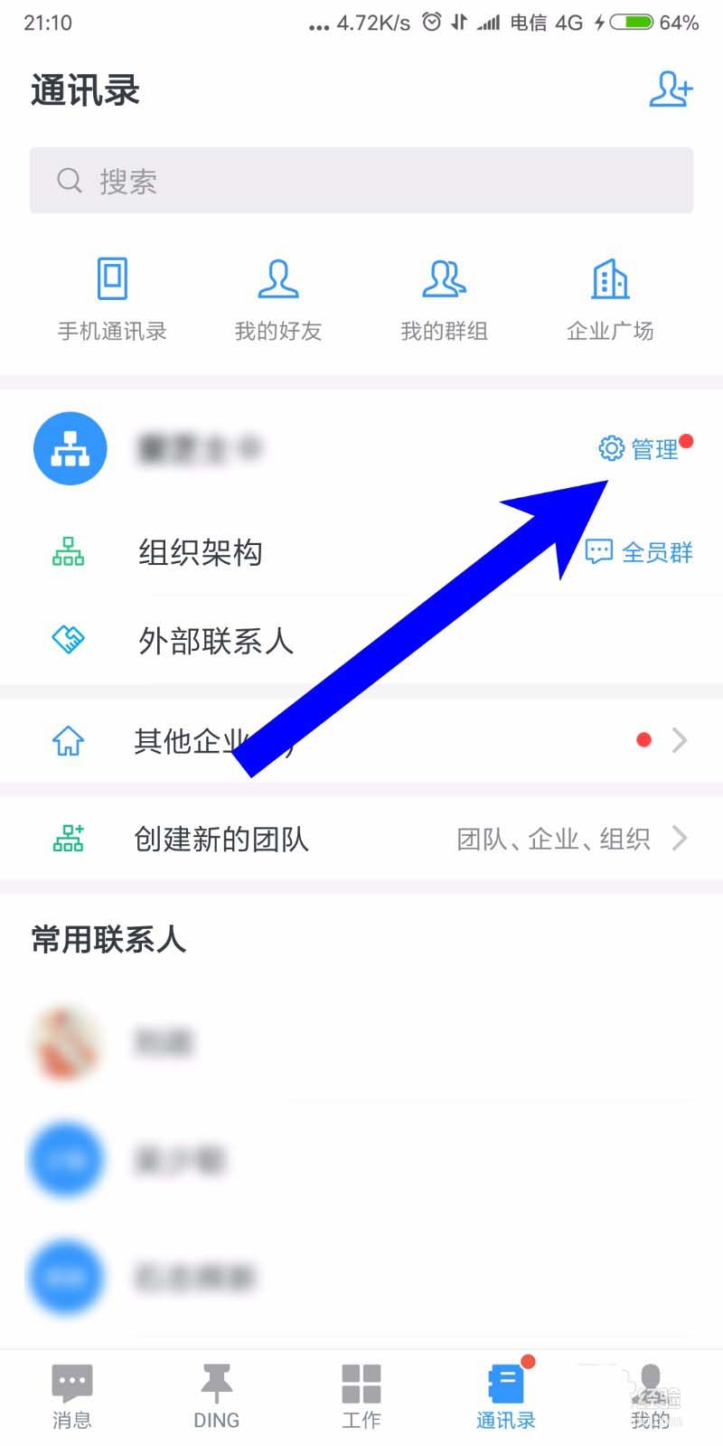 3、在通讯录中找到我们想要管理的团队,点击右侧的管理按钮,如下图所示,
