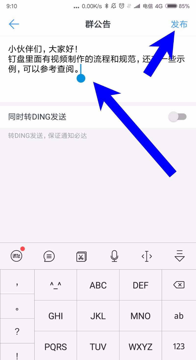 6、最后是我们想要发布的群公告内容,然后点击右上角的发布按钮即可,如下图所示,