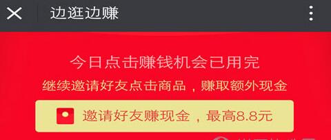 每天进入“边赚边逛”页面,点击任意商品返回就能赚取到现金(打开商品后,立即返回,就会弹出分享提示,分享后即可获取现金);除此之外,邀请好友点击商品,还能赚取额外现金。