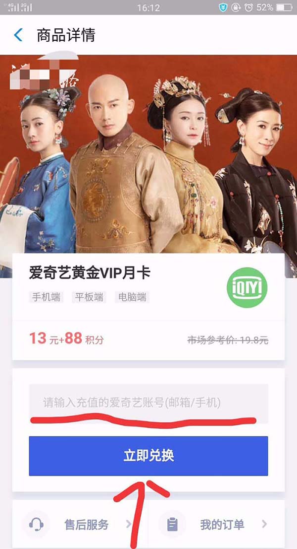 4、进入商品详情页面,输入一个邮箱或者手机号码,这个是等你购买月卡之后用来登录爱奇艺的账号,然后点击“立即兑换”,如图: