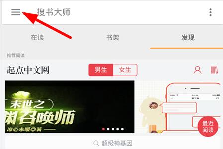 1、首先用户需要进入到搜书大师该APP之中,到主界面之后,点击左上角的横杠功能选项,这时候就可以打开个人列表界面;