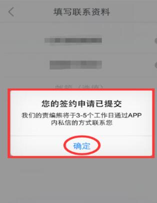 注意要填写好联系方式,以便编辑联系哦~填好联系资料后点击【提交申请】,然后就会弹出“您的签约申请已提交”的通知弹窗,点击【确定】,这样就能够完成签约申请咯~然后坐等编辑回复就OK啦!