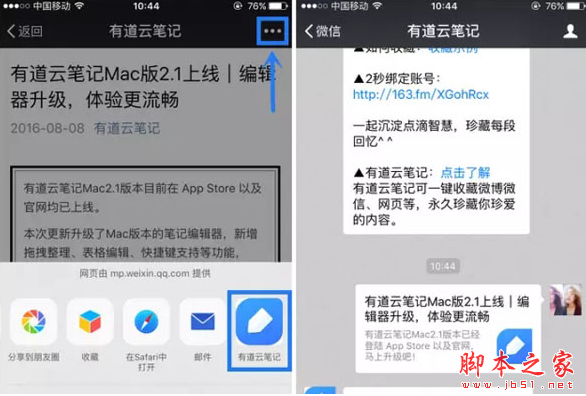 操作方法:点击任一微信文章页右上角「···」,向右滑动,选择「有道云笔记」,微信文章即保存到你绑定的云笔记中。