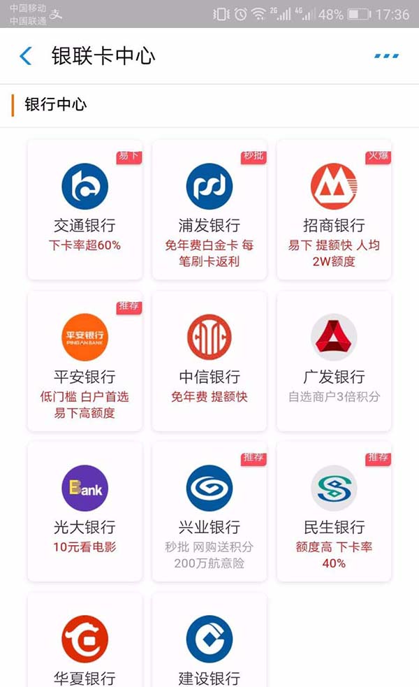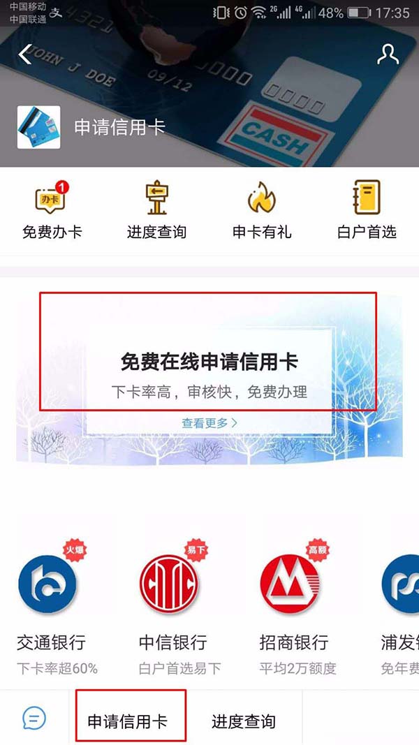 4、在申请信用卡官方号内点击信用卡办理进行自助申请。