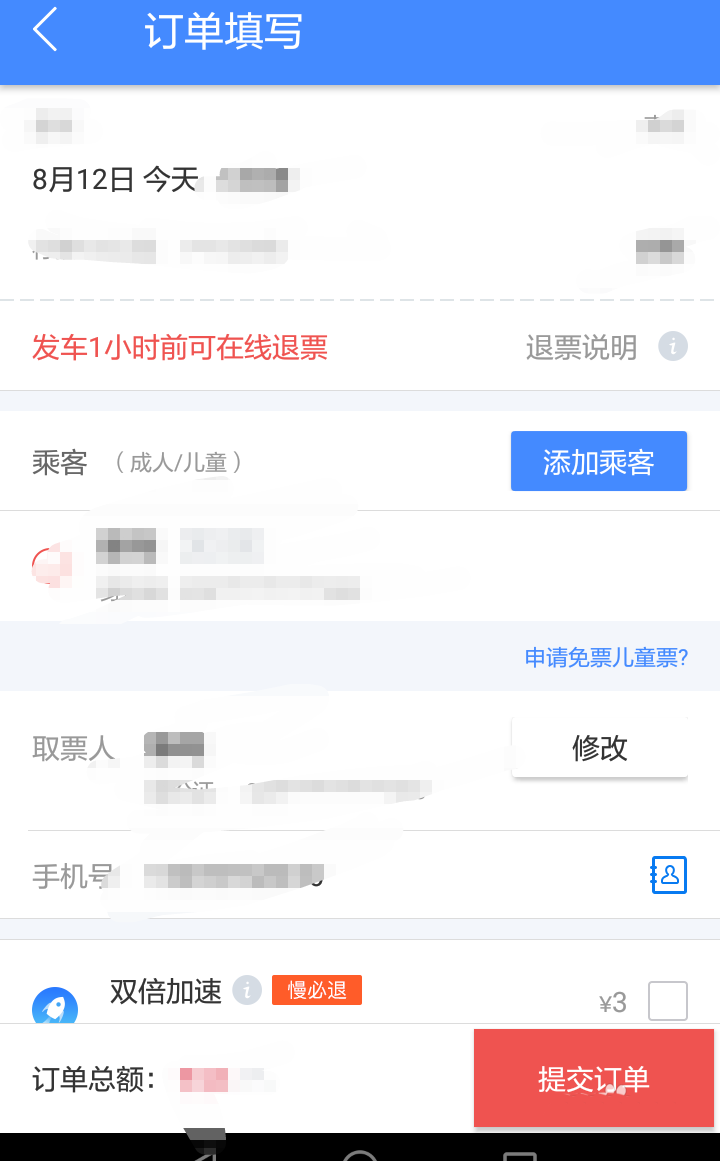 5、添加好了邮寄信息,在购买车票时候,填写好了买票人信息后,不要急着提交订单。