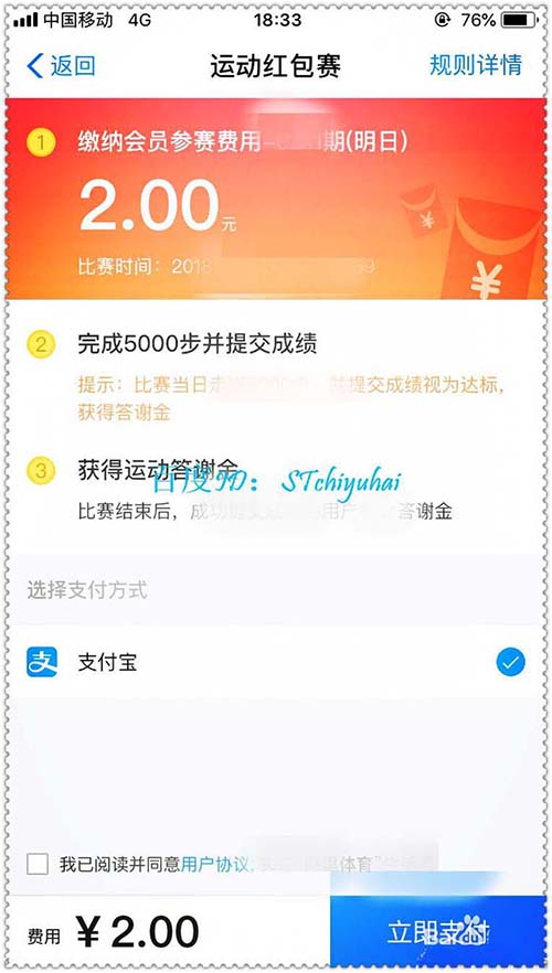 5、报名后也有一个简单说明,点击底部立即支付,先预交2元活动金。