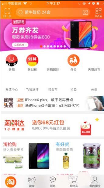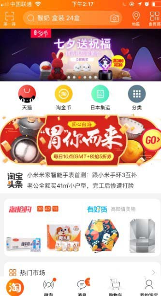 1、首先我们需要打开手机淘宝app,如下图所示。为iPhone客户端的淘宝首页页面。