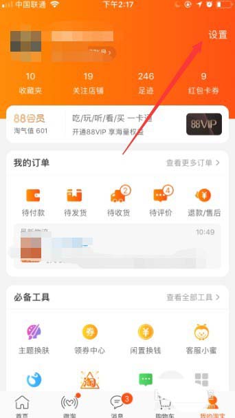 3、进入我的淘宝页面后,如下图所示。在我的淘宝中找到设置入口,在页面的右上角。