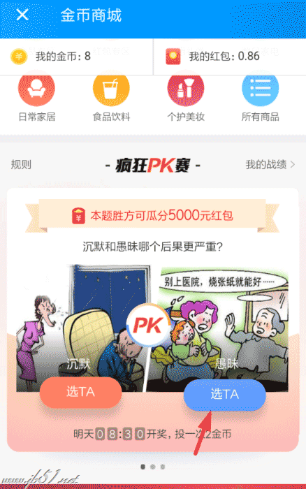 2、接下来从疯狂pk赛的活动里,大家就可以花费2金币选择支持pk中的一方,等待第二天的8:30开奖了。