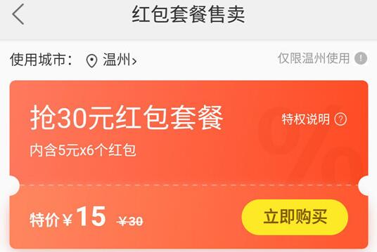 2、页面直接跳转到红包套餐售卖界面,目前统一特价15元,包含6个5元通用红包(满五元即可使用,相当于无门槛红包),需要注意的是目前仅对部分城市的特定用户开放购买,如看不到入口或无法参加,则可能是你所属的城市还未开放红包套餐活动。