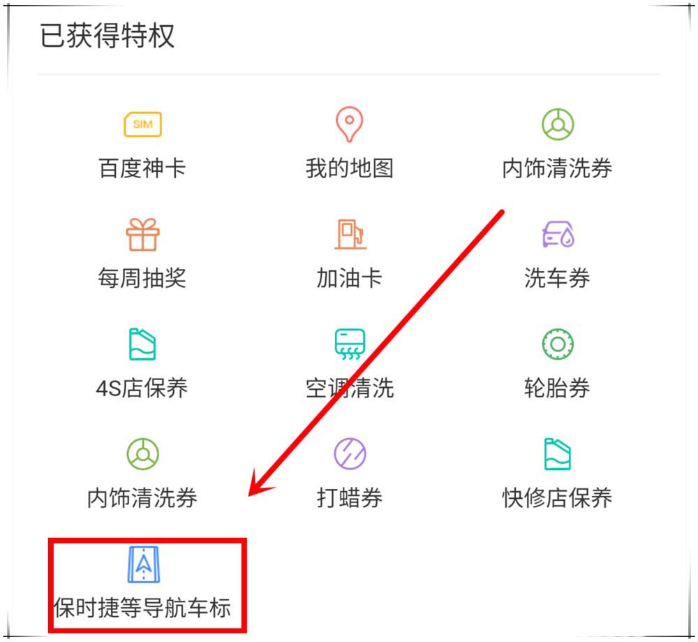 5、在找开的“我的特权”页面,“已获得特权”中找到“保时捷等导航车标”,点击进入下一步。