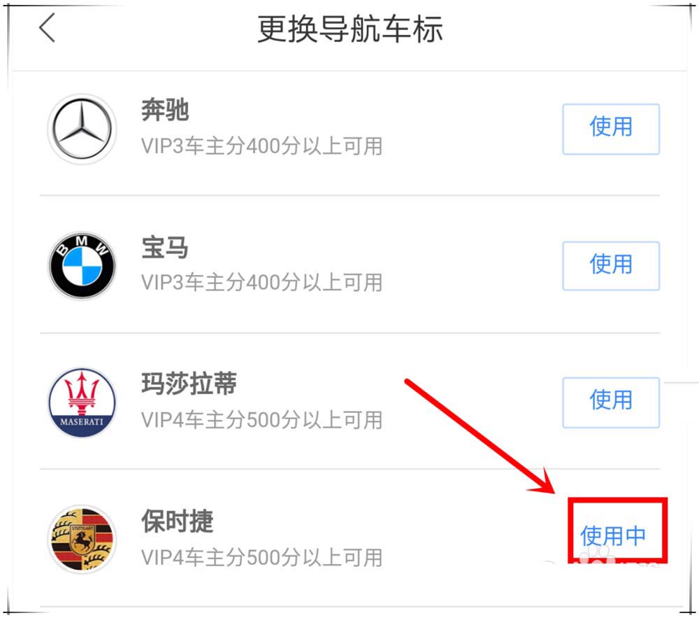 6、在“更换导航车标”页面,找到保时捷车标,点击使用即可将导航车标设置成保时捷车标了。其中还有很多其它样式的车标,大家可以根据需要选择。
