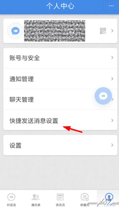 1、现在用户们要想开启子弹短信里的悬浮球功能,需要先点击进入个人中心页面,然后从列表里选择“快捷发送消息设置”功能。