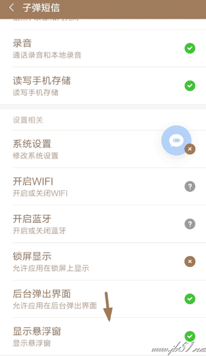 3、而如果没有出现悬浮球的话,大家就需要去手机设置页面里开启子弹短信的“悬浮窗”权限哦!