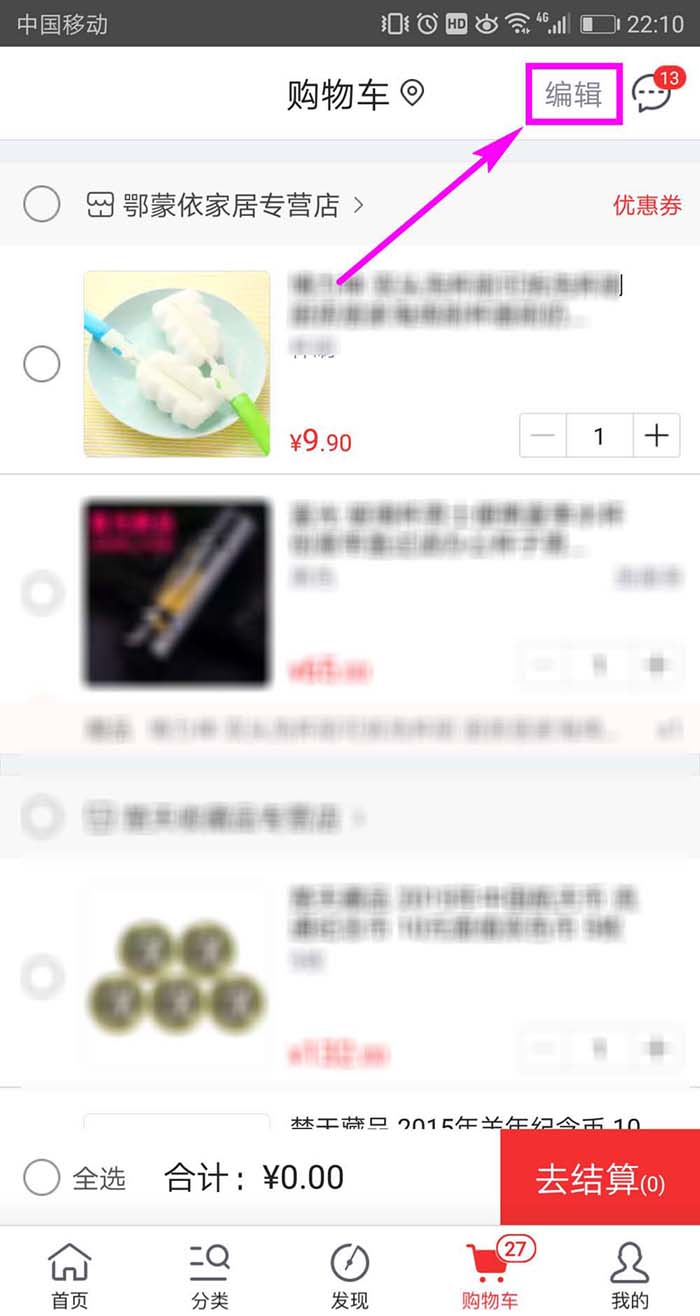2、接着在购物车页面右上方找到并单击【编辑】按钮,如图所示。
