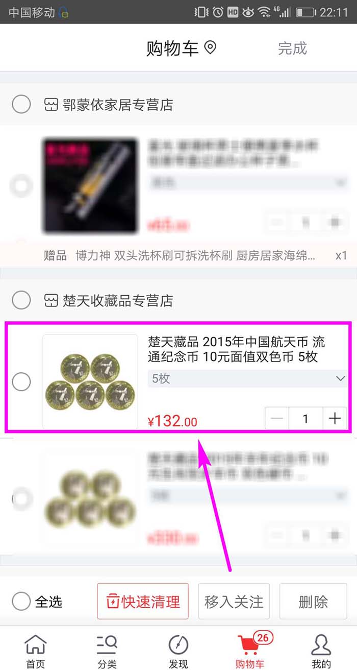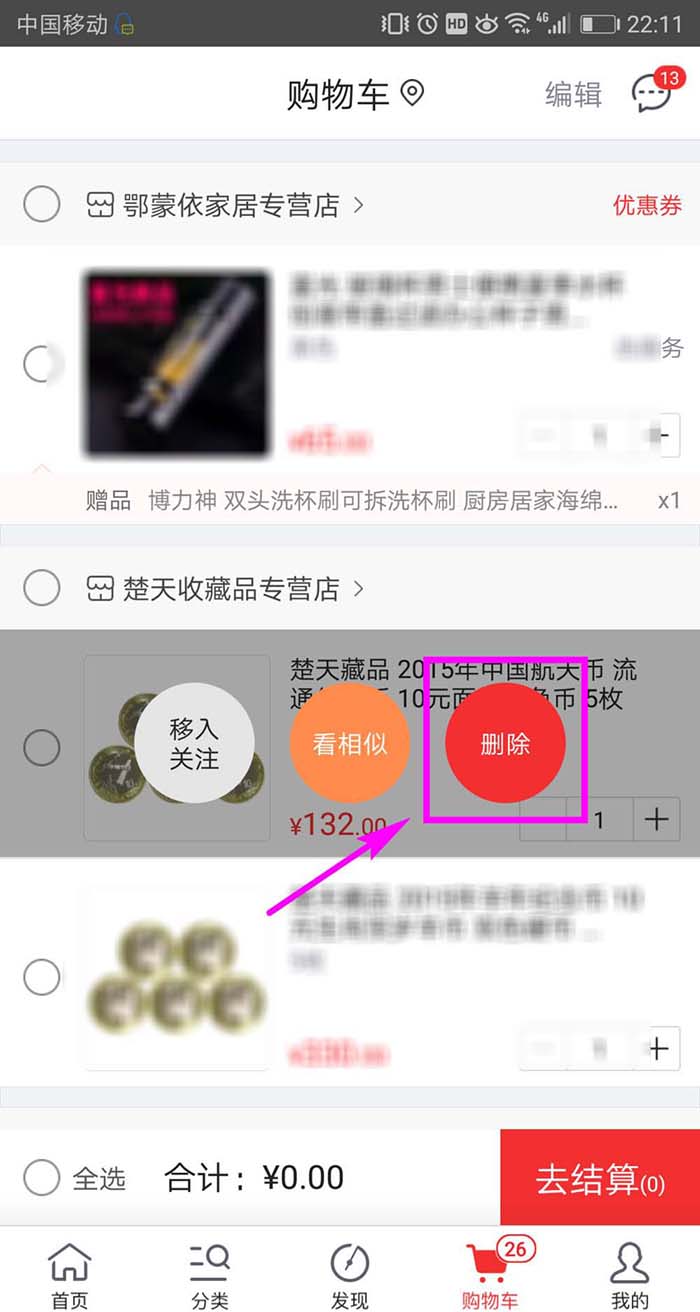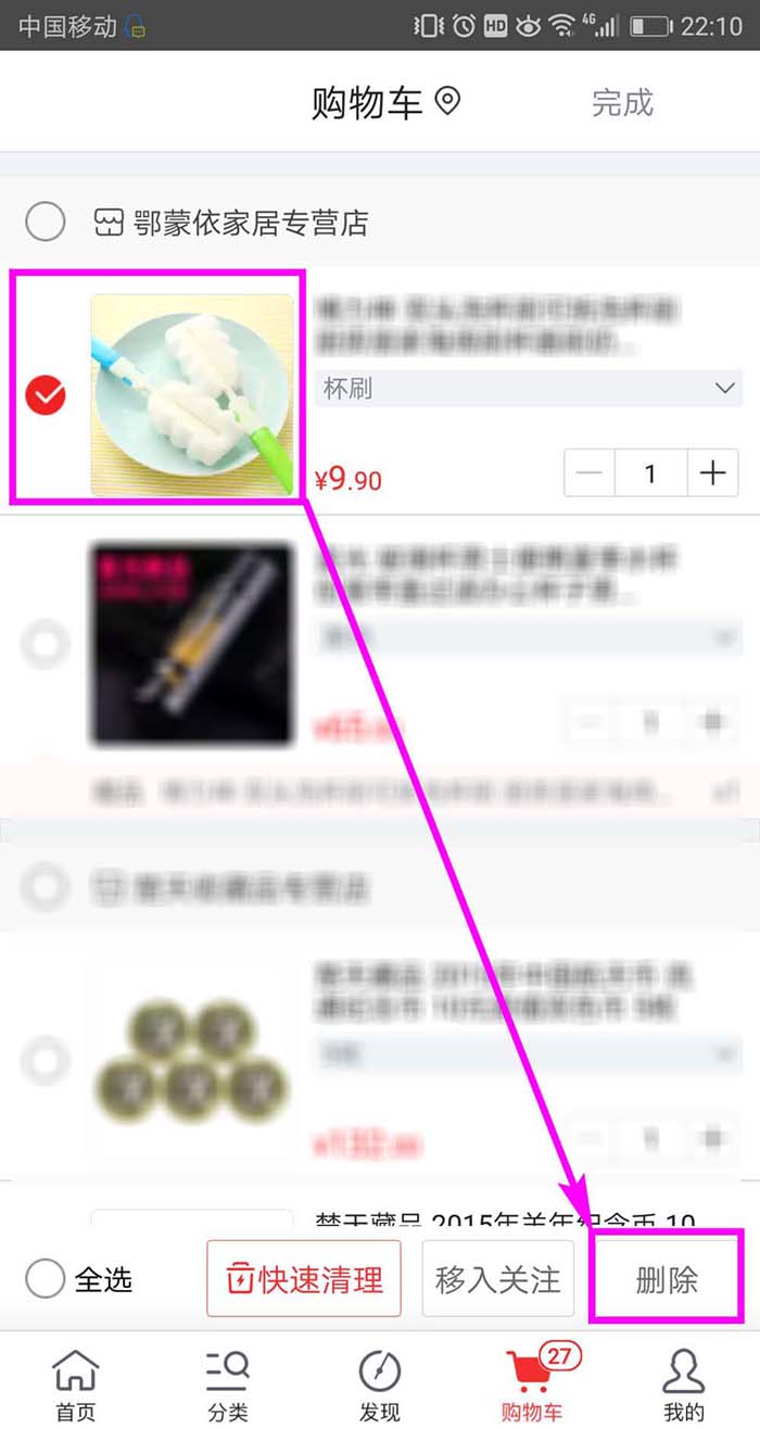 3、然后点击选择要删除的商品前面的复选框,将其勾选,然后点击屏幕右下方的【删除】按钮。