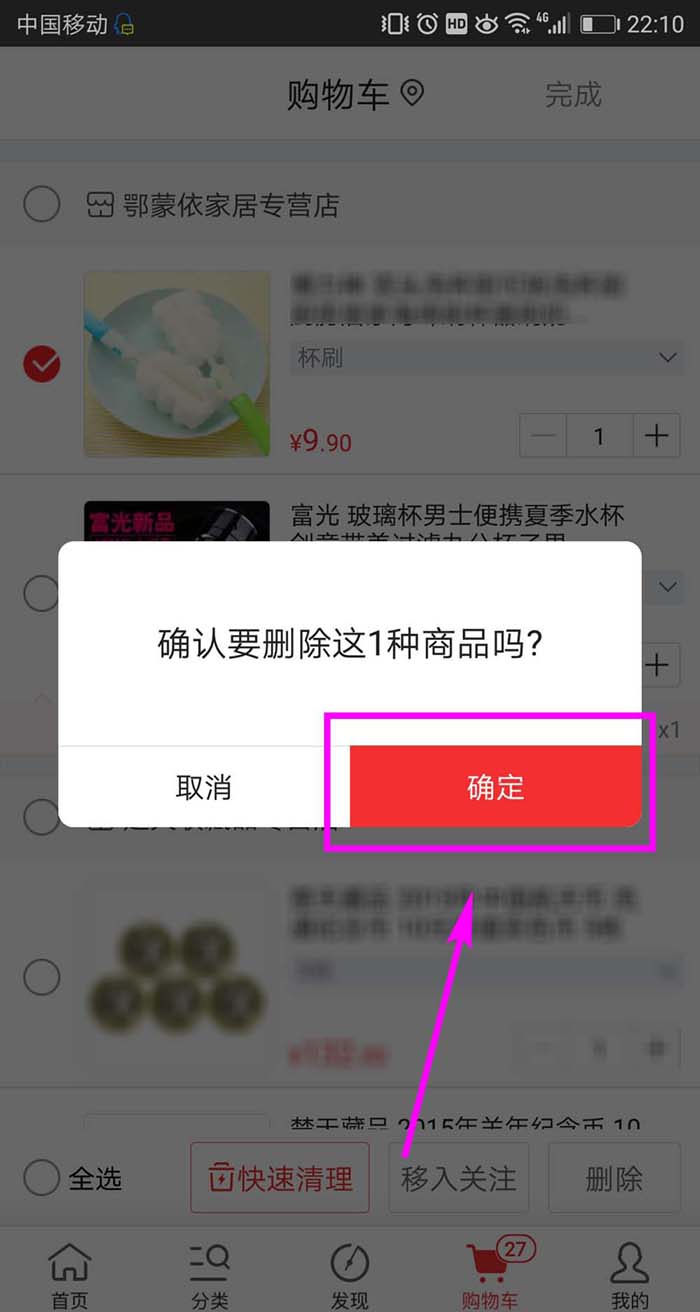方法一、:在购物车页面长按要删除的商品