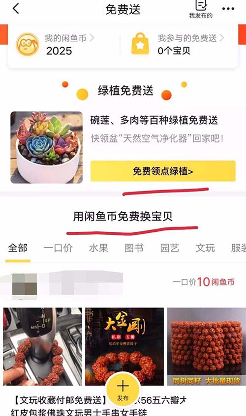4、进去后点击免费用闲鱼币领宝贝,如下图。