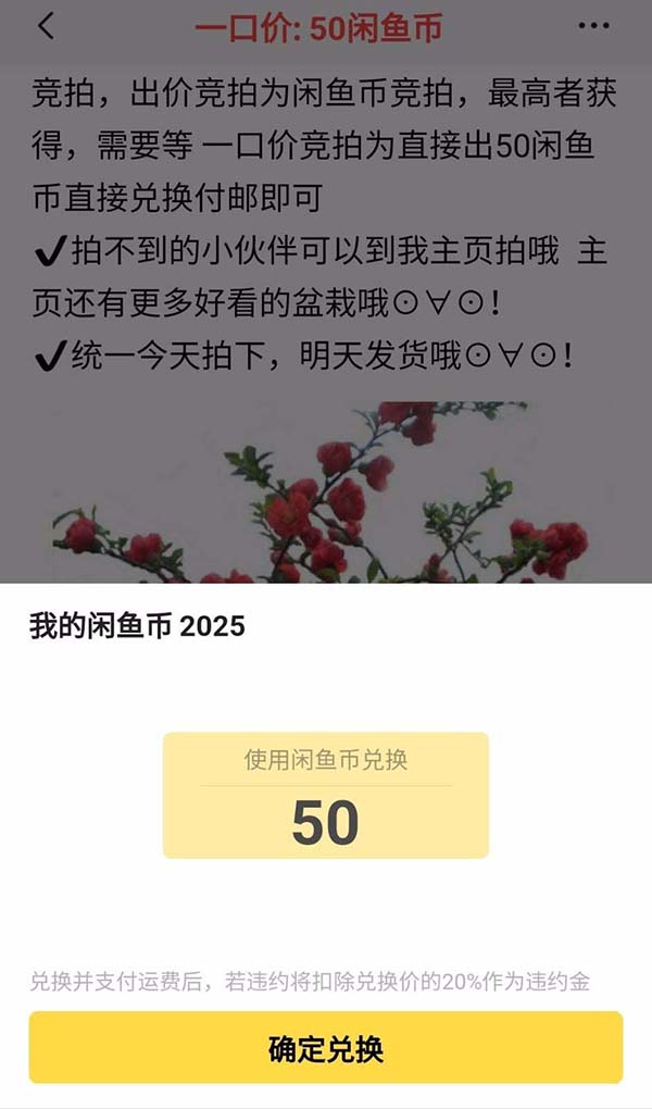 6、点击宝贝下方的我要兑换,如果闲鱼币足够支付,点击确认兑换,支付运费,就可以了。如果未支付,将会扣除你20%闲鱼币作为违约金。