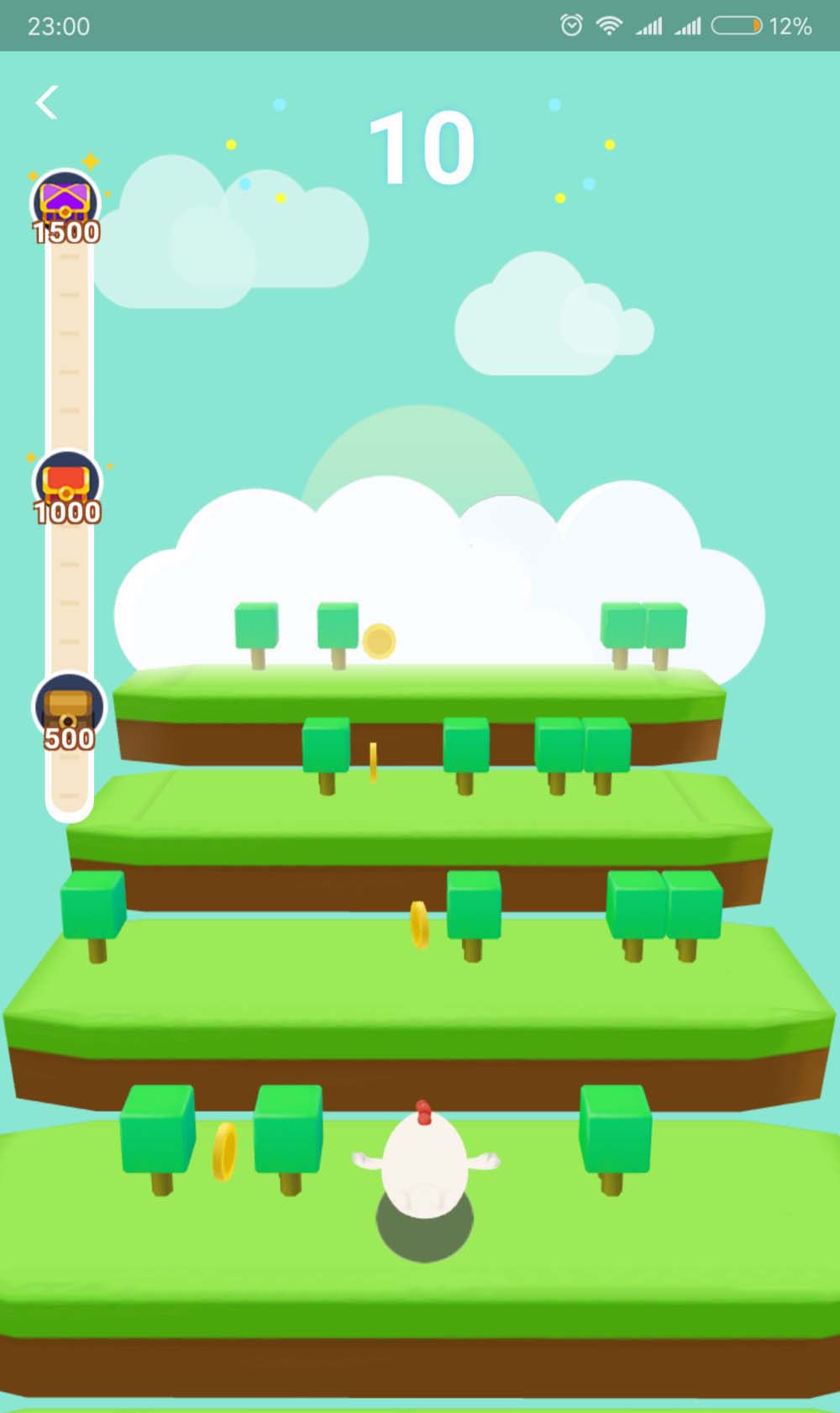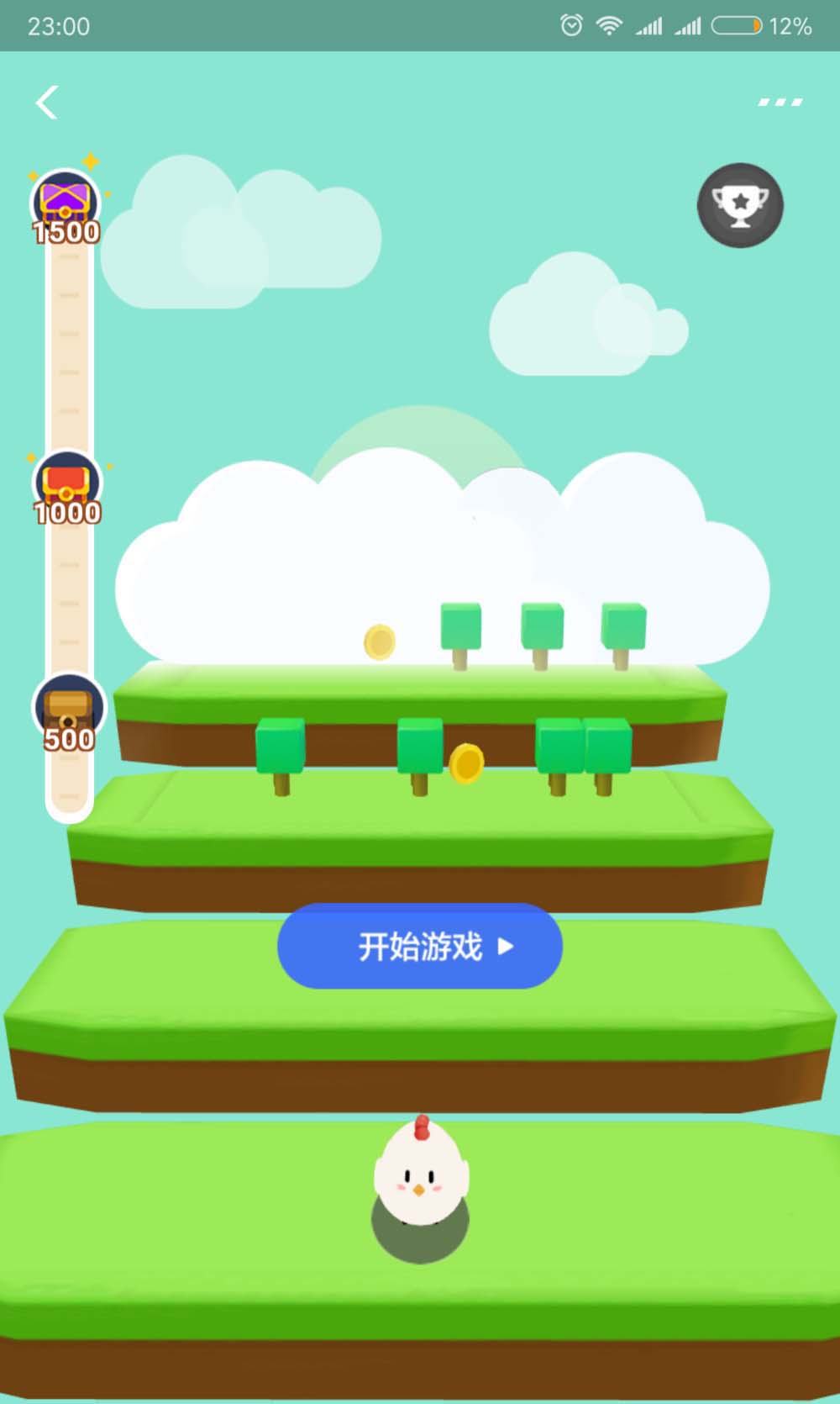 5、可以看到游戏是一个个台阶一样的,小鸡是通过蹦跳来攀爬,中间不能撞到小树上,如果一旦撞到树上,游戏就结束了哦。