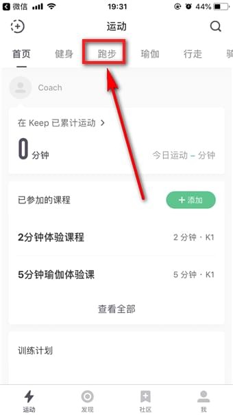 首先打开keep APP,在运动页面的上方栏目中找到并点击【跑步】