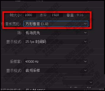 7、在帧大小这里,设置参数为1080;在水平这里,设置参数为1920;像素长宽比为方形像素。