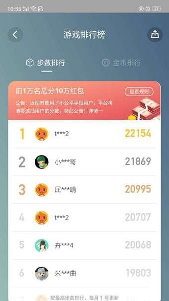 3. 总奖金池每月10万,其中前1-10名可瓜分5000元红包,11名-100名可瓜分10000元红包奖池,101名-1000名可瓜分35000元红包奖池,1001名-10000名可瓜分50000元红包奖池;如榜单总人数不足10000,按照榜单实际的人数按比例发奖给中奖用户。