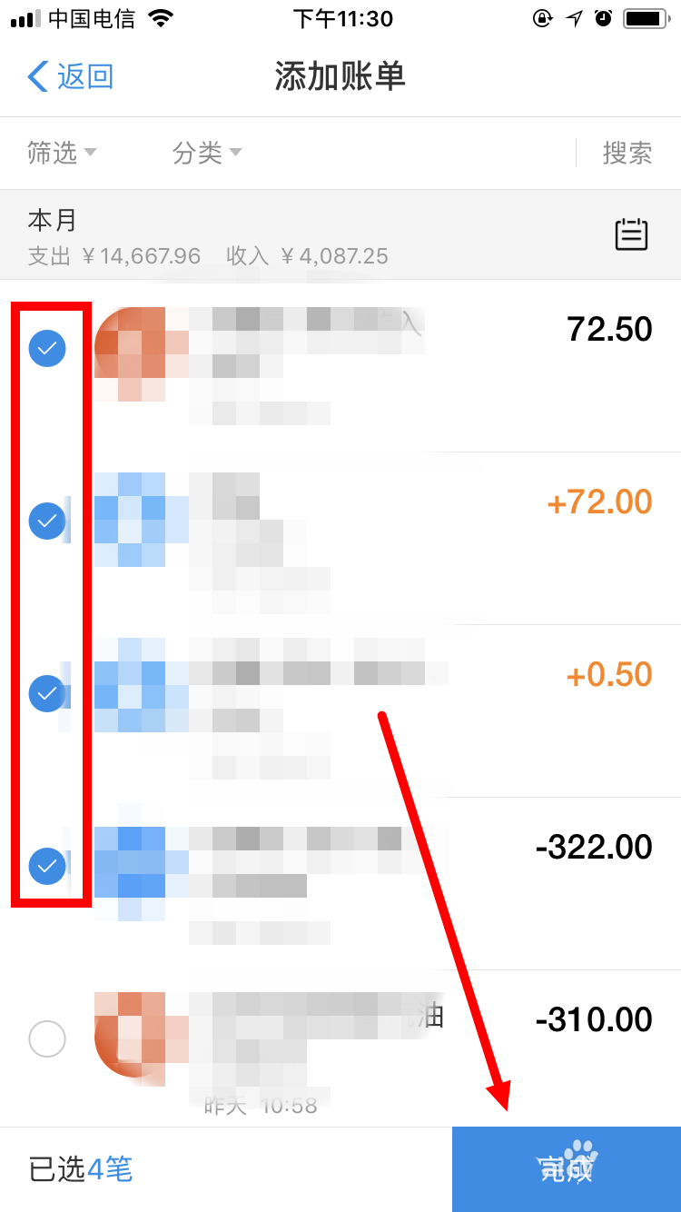 8、将需要添加至该标签内的账单内容前面打钩,然后点击 完成 。