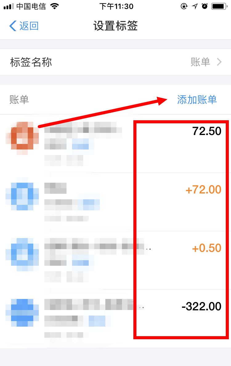 9、OK,该新建标签下的账单就添加成功了。如果还有需要添加进来的账单内容,可以点击下图页面中的添加账单。