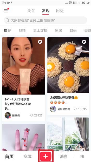 2、点击打开小红书后,在首页中点击底部的【+】按钮进入到拍摄界面。