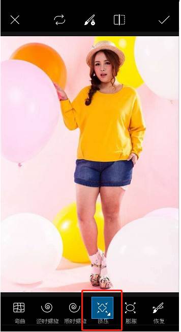 5、点击“挤压”,轻轻点击即可瘦腿,最后点击保存。