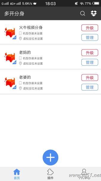 1、首先从脚本之家网站下载多开分app,然后安装打开,点击中间的加号。