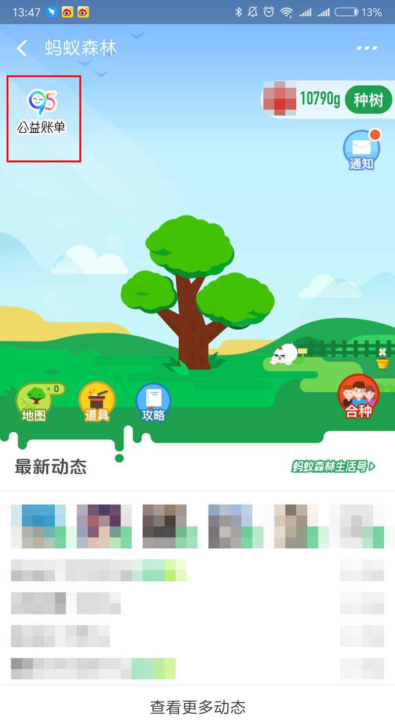 1、先进入到蚂蚁森林,左上角可以换看到一个【公益账单】的标志,点击进入。