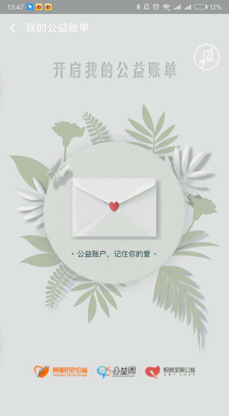 3、进入后可以看到你的公益账单是一封信,向上滑屏打开它。