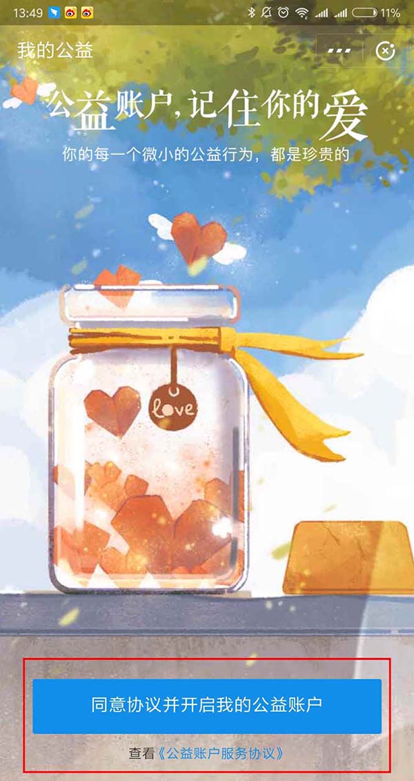 7、进入公益账户钱,需要先同意协议,就可以顺利进入啦。