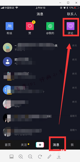 5、我们也可以进入“消息”,点击右上方的“评论”。