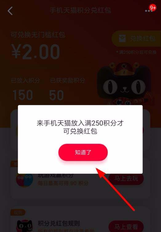 3、但是我们点击兑换红包要满250积分才可以兑换红包。