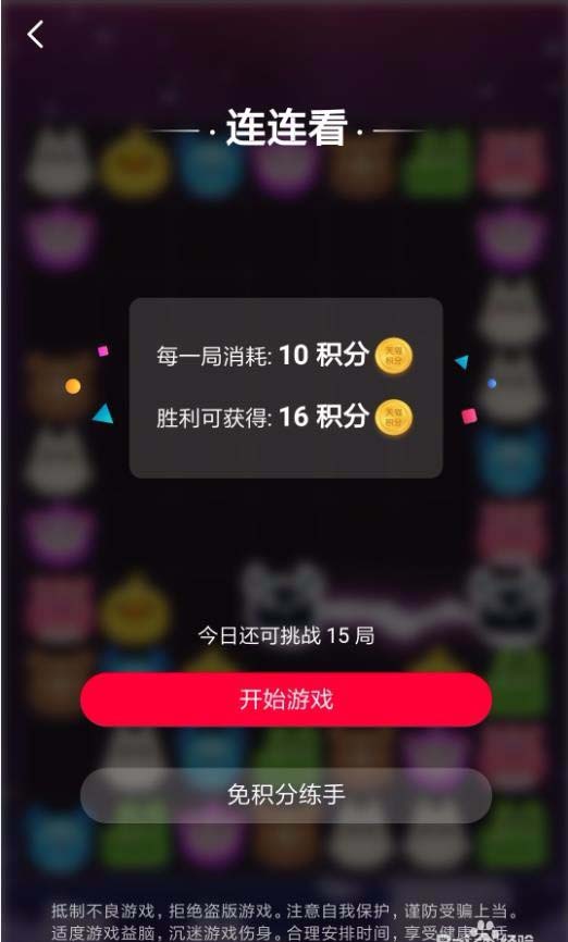 7、以游戏连连看为例,我们每玩一局需要消耗时自己的10积分,但是我们胜利可以获得16积分,相当于我们只要赢了一局可以获得6积分。我们一开始我们可以使用免积分练手来提升我们自己的游戏技术。