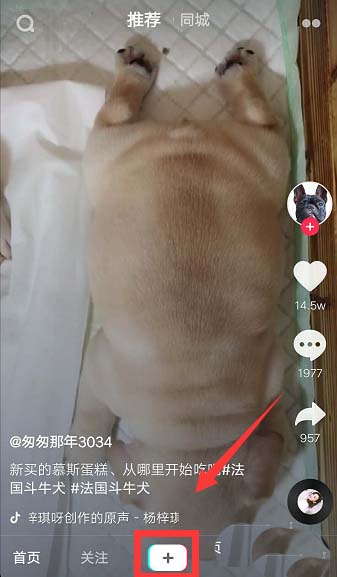 1、首先打开抖音APP,点击下方【+】。