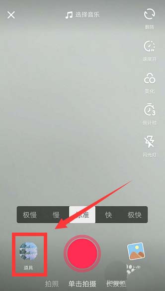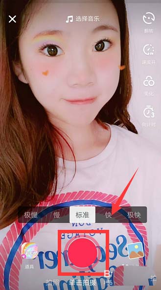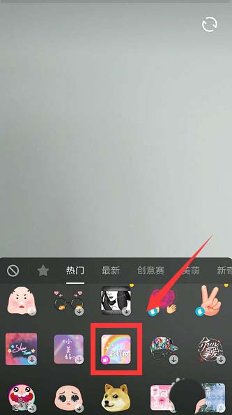 2、进入视频拍摄界面,点击左下角道具按钮,选择【彩虹妆】。