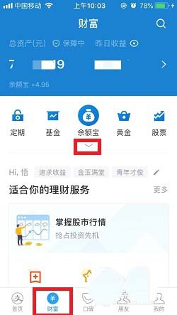 2、点击底部导航处的【财富】,在财富页,点击向下的箭头符号。