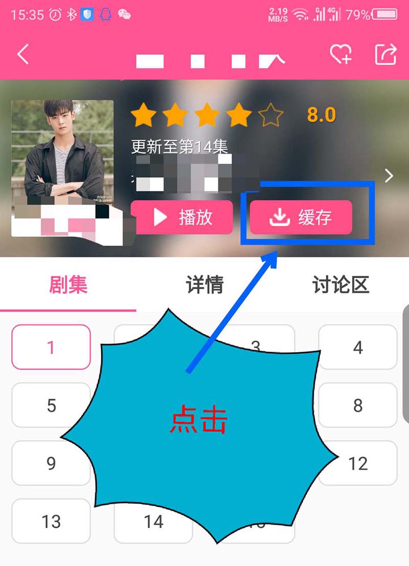2、打开视频后,在详情界面,点击缓存选项。如图所示