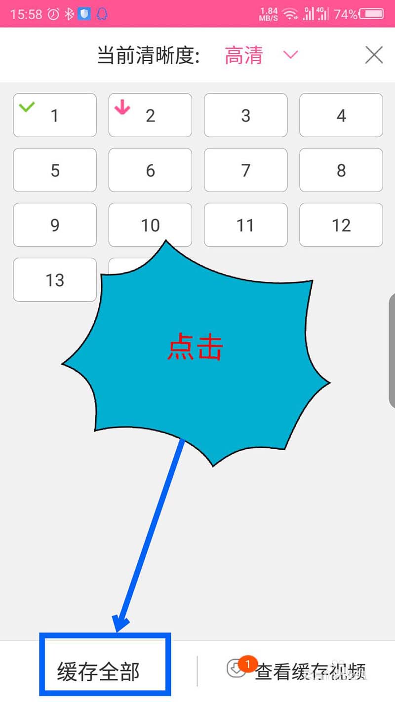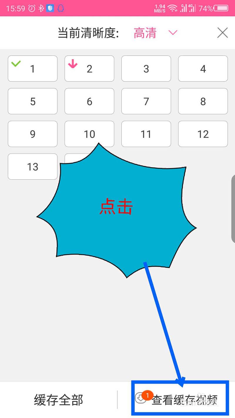 3、在缓存界面,点击选择当前下载的视频的清晰度。如图所示